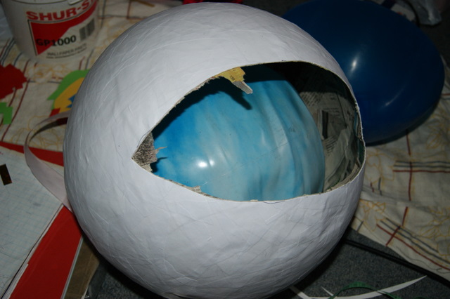 A pinata needs to be hung up so I attach a ribbon right round (plus extra obviously so you can tie it around a pole for hanging) and secure it with tape then paper mache over it with a white layer.